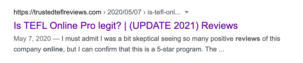 One of the threads was initiated by the fake graduate we mentioned earlier. Another thread was also started by a competitor, this time using SEO-friendly keywords like โIs TEFL Online Pro Legit?โ